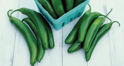 Deep green Serrano peppers. Sturdy compact plants, suitable for containers or in ground. |